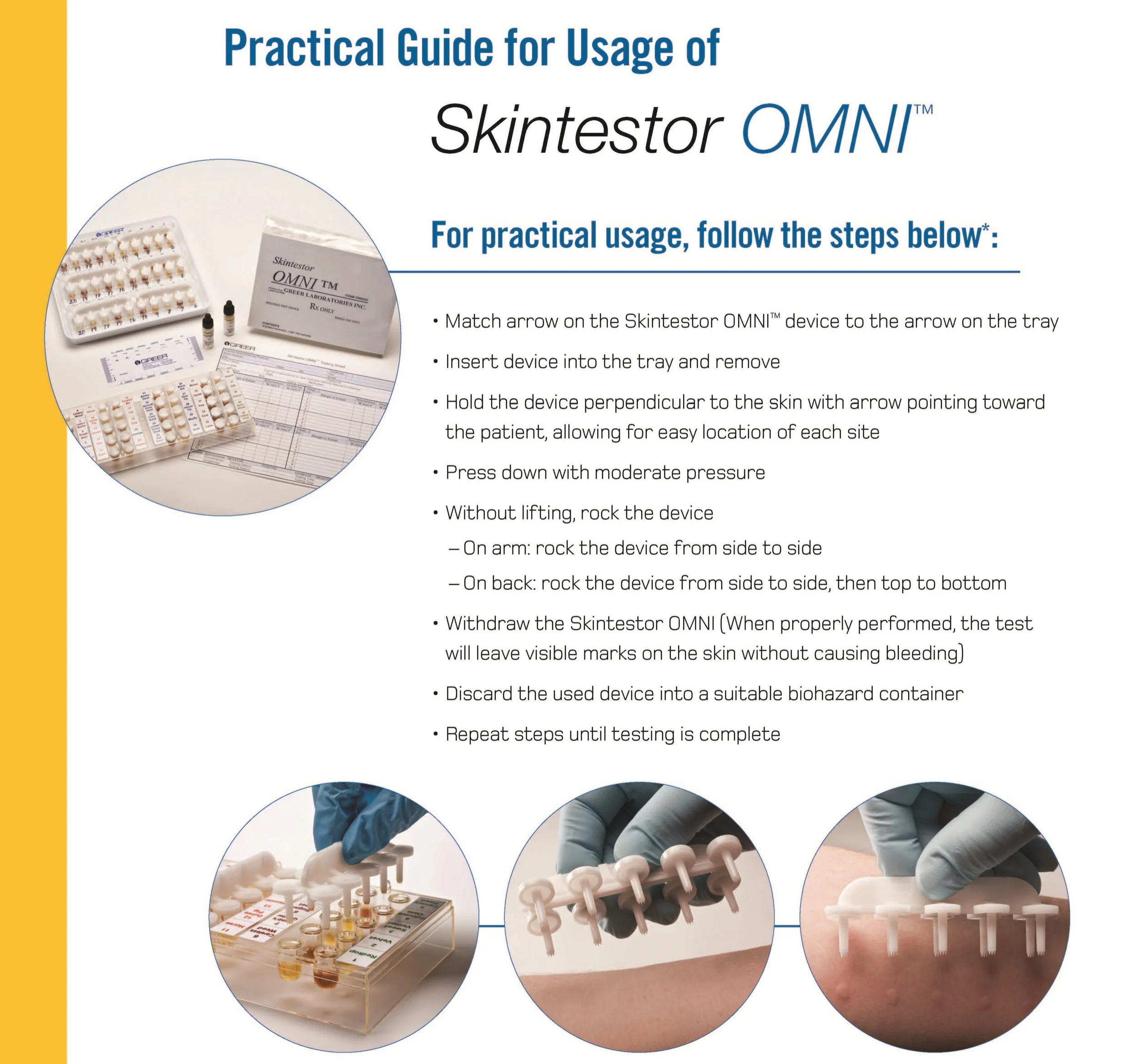 For speed and dependable efficiency, trust the Skintestor OMNI™. This self-loading, 10-head multiple-site skin testing device lets you test for multiple allergens in a short period of time. Discover greater flexibility in testing setups with a 40-well tray. The Skintestor OMNI offers efficiency, with an average of 1,031 tests per 5 mL vial. Self-loading, multiple-site skin testing device – Multiple tests – Broad screens in less time • 40-well labeled tray for flexibility in testing setup • 10 test sites per applicator – 40 allergens tested with just 4 applications • Flexible application options on arm or back. Large, covered wells – Better maintenance of allergen integrity – Less opportunity for cross contamination • Ample space for tray labeling – Easy to read – Customized laminated labels available • Small tray footprint – Easier refrigerator storage – Able to pre-fill more trays • Compliant with OSHA Bloodborne Pathogen Standard.