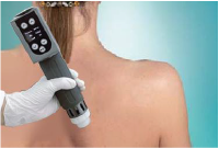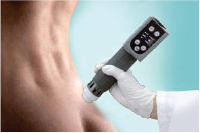 The penetration depth can be varied at the therapy source by exchanging gel pads of different thicknesses. An additional advantage is the large area energy coupling with an aperture angle of 94°. This lowers the energy density at the surface of the skin and reduces pain. The specifically dosed energy has 20 intensity levels allowing treatment without sedation.